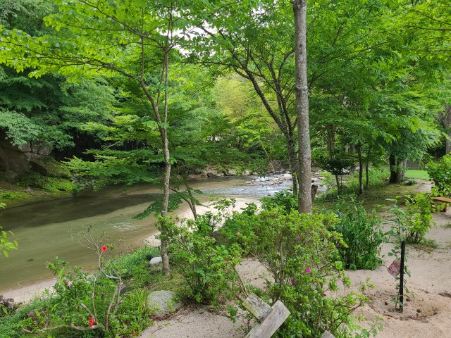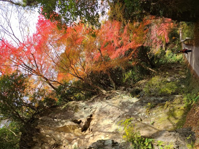 橋の先にはすらっと伸びた紅葉が姿を現します。 川に沿って散策できる遊歩道が片道30分ほど続きますが、絶え間なく赤や黄色の鮮やかな紅葉が歓迎してくれました。