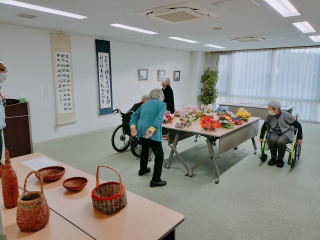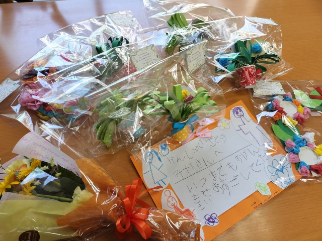 介護棟しらゆり館へ十数名の園児が来館し、機能訓練室で一列になってご挨拶してくださいました。 花の日にちなんで、折り紙で手作りしたお花やメッセージカードをいただきました。 また、童謡「ぶんぶんぶん」や手遊び歌「バスごっこ」を披露してくださり、ご入居者様は一緒に手を動かしながら終始ニコニコ笑顔でした。