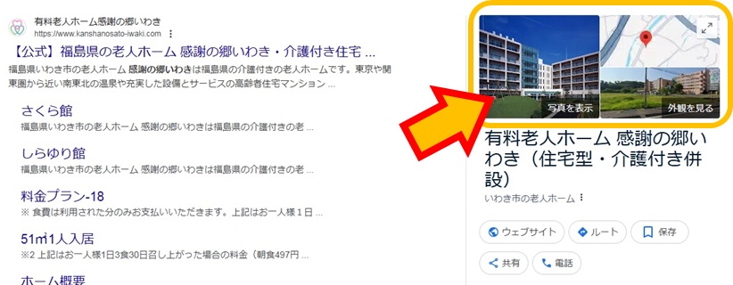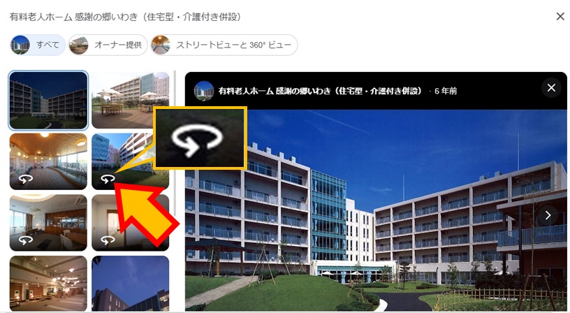 《 検索のしかた 》 @ googleのブラウザで「感謝の郷いわき」と検索し、右側の"写真を表示"をクリック A 矢印マークの画像をクリック B マウスで見たい方向に動かす