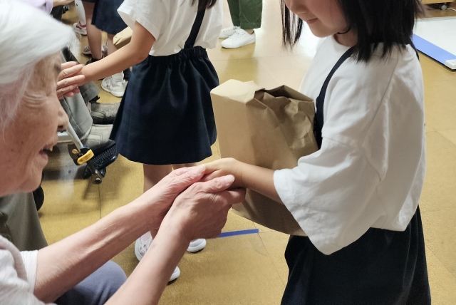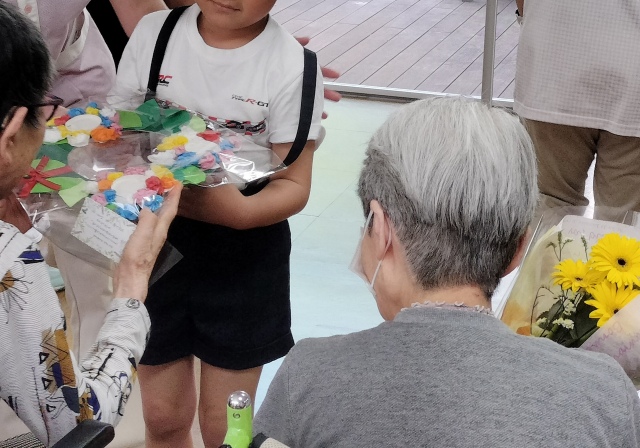 ご入居者様からも園児みんなへプレゼントをお渡しし、代表してお礼の言葉をお伝えされていました。 来てくれたのは年長さんとのことで「来年は小学生。私が小さかった頃は戦争があって大変だったけれど、小学校生活を楽しみにしてください」とお話しされていました。 最後に園児が全てのご入居者様と握手しておしまいとなりました。 認定こども園「りんごの木」の園児の皆さん、そして先生方、素敵な時間をありがとうございました。 |