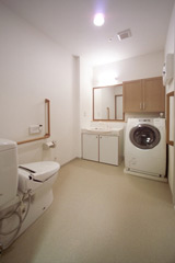 手摺とヘルパーコールを設置した洗面台と暖房洗浄便座のトイレ